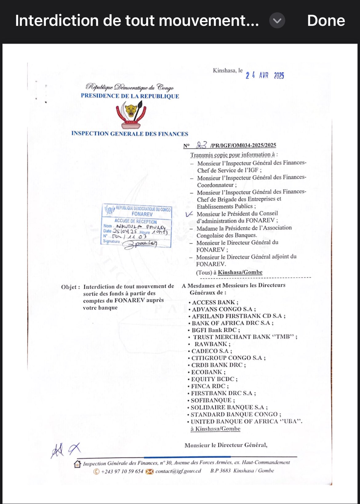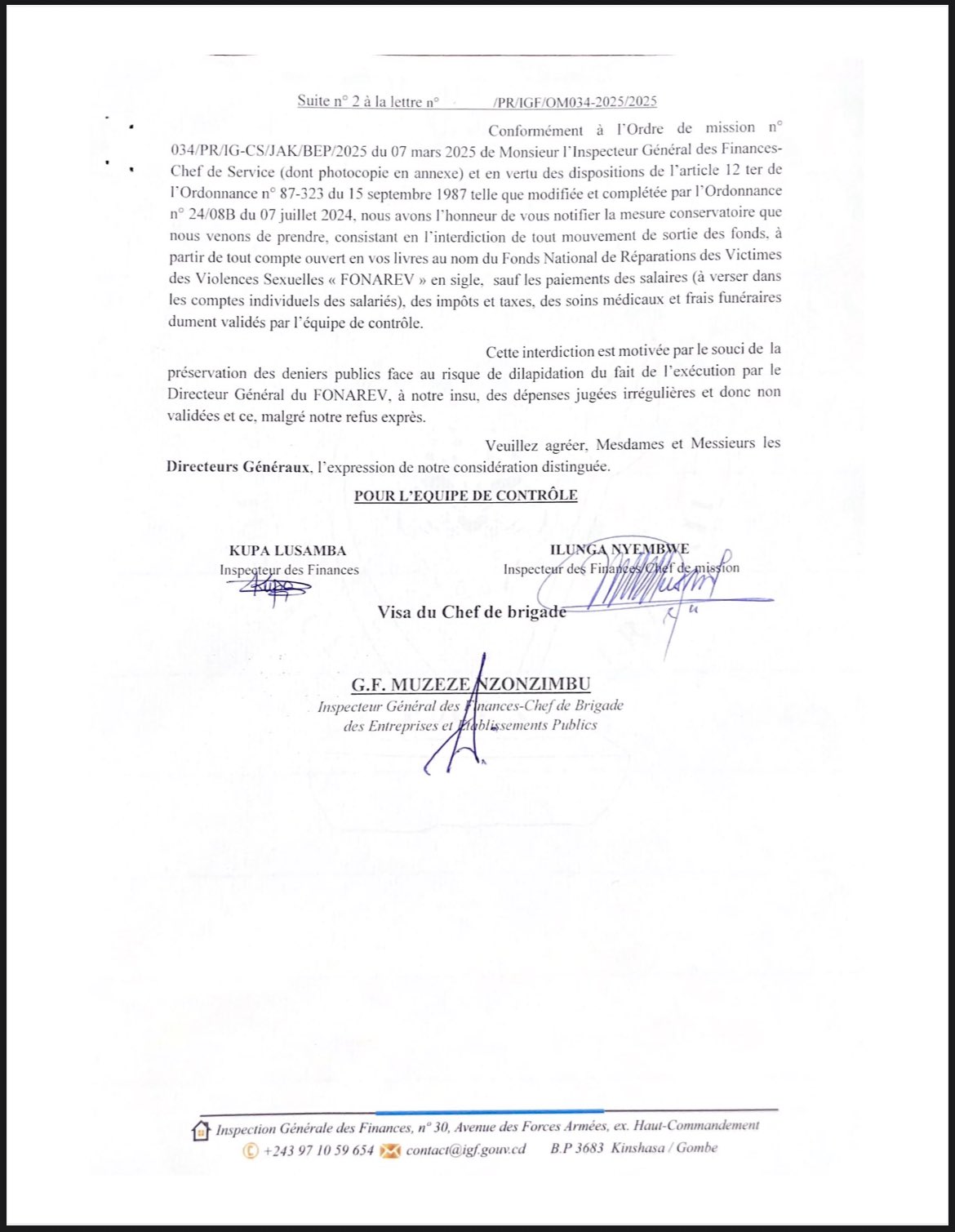 The IGF’s July 7 warning, signed by Inspectors Kupa Lusamba, Ilunga Nyembwe, and Chief G.F. Muzeze Nzonzimbu, follows an April 25, 2025, account freeze lifted within 24 hours—allegedly due to high-level pressure from the Haut-Comndement des Forces Armées. With compliance deadlines looming, transparency is critical to save FONAREV’s mission.