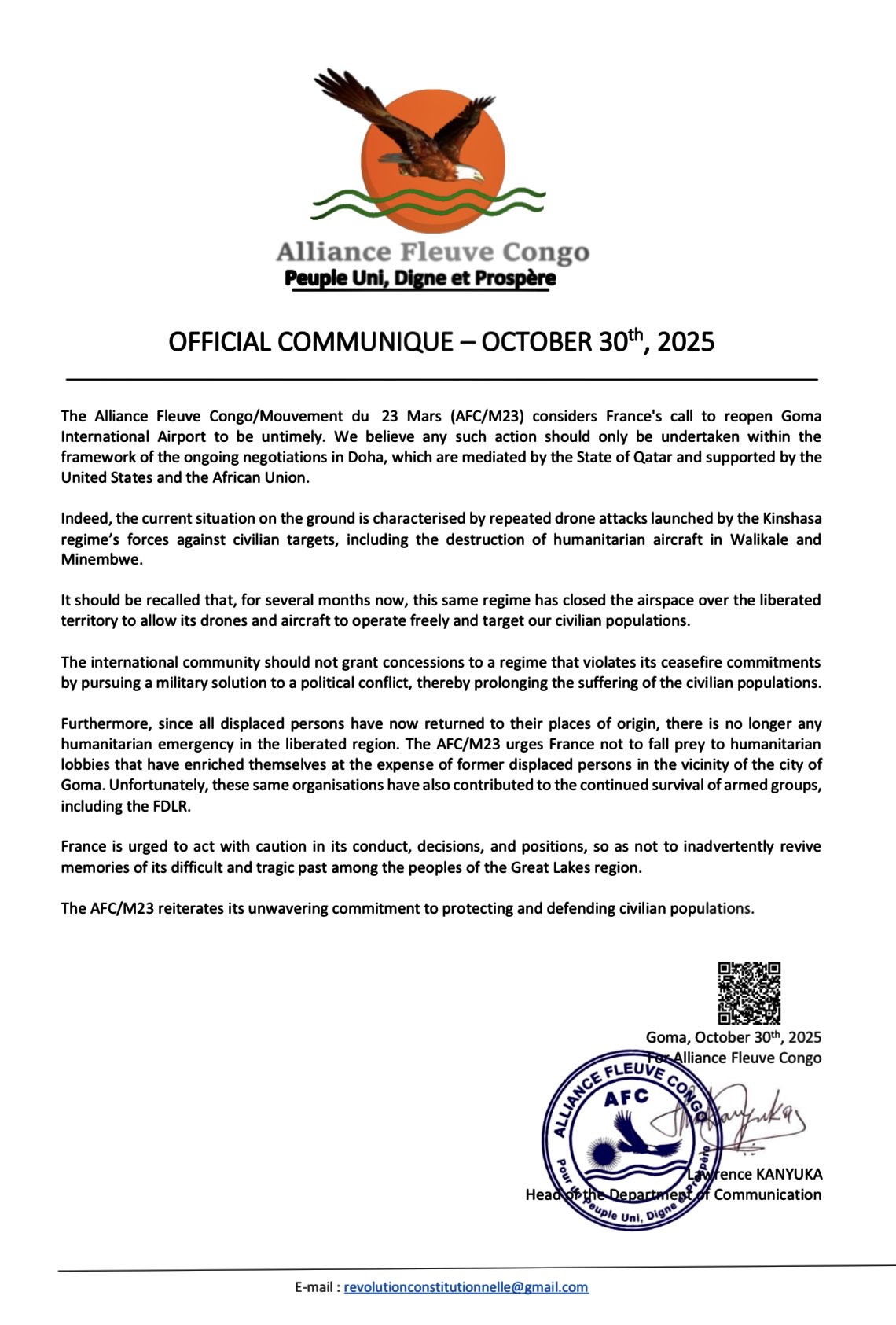 The rebels accused Kinshasa of repeated drone strikes on civilian targets, including the destruction of humanitarian aircraft in Walikale and Minembwe.
